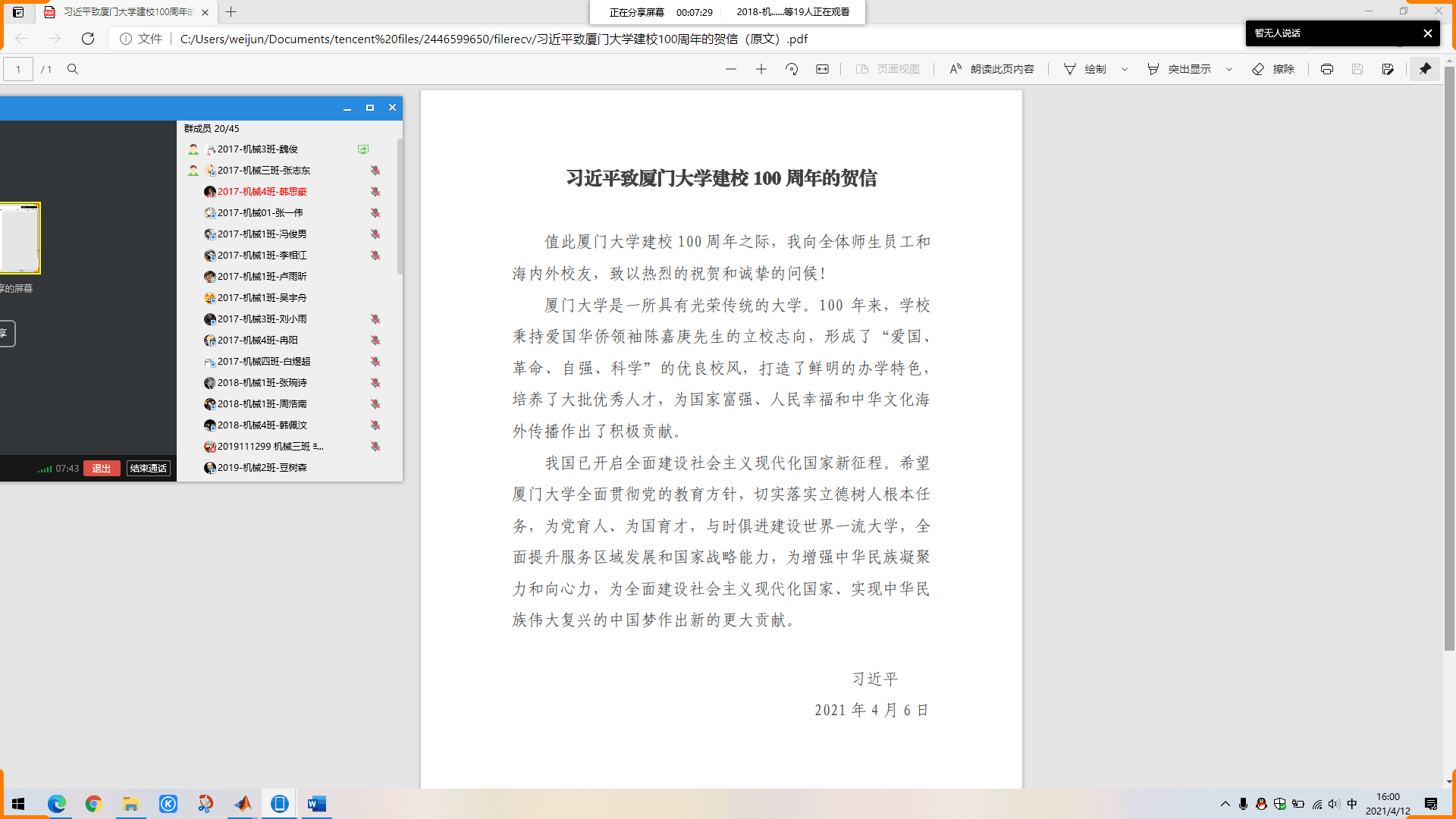 为深入学习贯彻总书记贺信精神,增强学生党员历史担当,机械本科学生第一党支部于2021420日至21日开展习近平致信祝贺厦门大学建校100周年贺信精神学习主题活动。