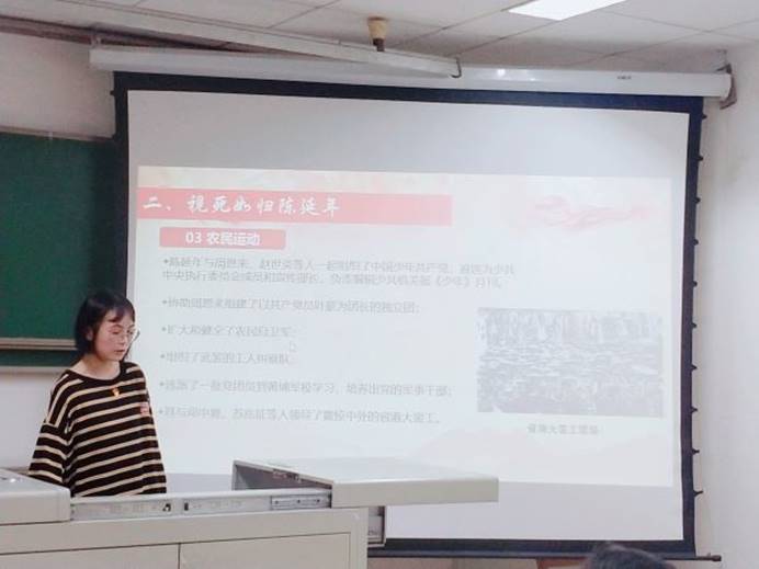 首先郭沛佩同志讲述了新民主主义革命时期及社会主义建设时期中的“英雄模范夏明翰”、“视死如归陈延年”、“两弹元勋钱学森”的故事。夏明翰英勇就义、陈延年从容赴难、钱学森艰难回国等等都表现出他们强烈的爱国之情,即使前方道路艰难险阻,只要祖国需要便义无反顾投身于国家。