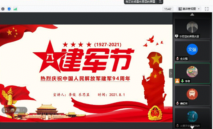 研究生之窗讯(记者 计丹 摄影报道)8月1日晚7时,中共德信体育.(中国)官方网站硕士第八党支部开展“庆祝中国人民解放军建军94周年”主题线上党日活动,会议由德信体育.(中国)官方网站硕士第八党支部成员李俊、乐思显同志主持。