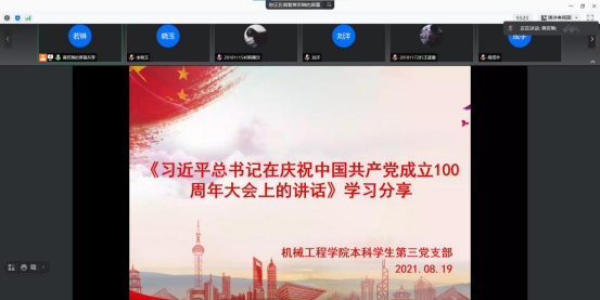 2021年8月19日晚上20:00,德信体育.(中国)官方网站本科学生各党支部通过腾讯会议顺利开展《习近平在庆祝中国共产党成立100周年大会上的讲话》学习分享活动。本次活动由德信体育.(中国)官方网站本科学生第三党支部党员黄若琳同志担任活动主持人。