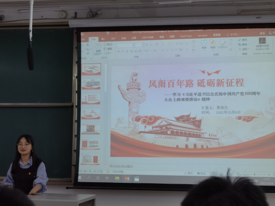 为响应上级党组织号召,积极学习习近平总书记系列重要讲话精神。2021年10月9日,机械本科学生第一党支部在X2420开展了“习近平总书记在庆祝中国共产党成立100周年大会上的重要讲话”的学习分享活动。