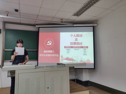 宗珠毓秀同志主持开展了研究生荣誉称号评选工作,经个人申请,党支部确认了候选人名单,各候选人依次上台陈述本人在2020-2021年度中思想上、科研上和学习生活上的进步以及取得的成果。经无记名投票,党支部决定推选段安东哲同志为优秀研究生干部推荐对象;宗珠毓秀、陈涛、冯珽婷同志为优秀研究生推荐对象;徐航、漆雯、娄亮、唐志锋同志为明诚奖推荐对象。