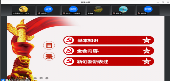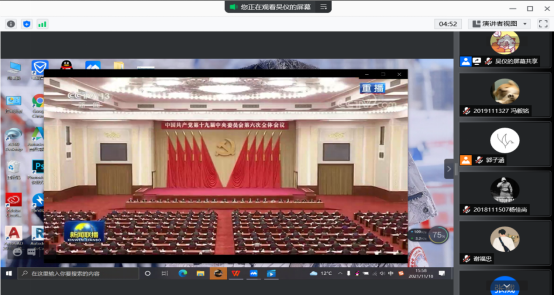 此次集体学习会由支部吴仪同志进行主持和分享,会议开始,吴同志以屏幕共享的方式向大家播放中国共产党第十九届中央委员会第六次全体会议全过程。