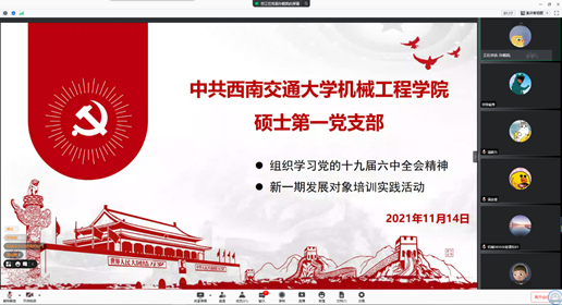 2021年11月14日,德信体育.(中国)官方网站硕士第一党支部组织全体党员开展党支部会议,本次会议线上进行,本次会议参与人数共80余人,包括全体支部党员、全体入党积极分子以及发展对象。会议内容包括两项:组织全体党员学习党的十九届六中全会精神以及新一期发展对象培训实践活动,本次会议由孙舰凯同志主持。