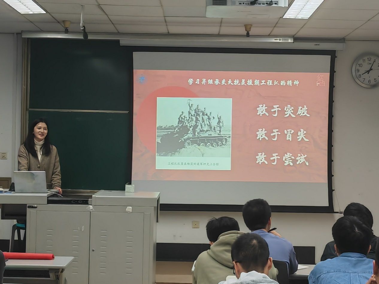 2023年11月6日,机械22级博士班党支部协同土木21级博士班党支部在九里校区J4222教室成功开展了“弘扬红色传统 传承民族精神”校级示范性党支部特色活动。本次活动围绕伟大的“抗美援朝”精神展开,特意邀请了学校研究生“红路”理论学讲团刘馨蔓同志向两个支部的同学进行党史宣讲。