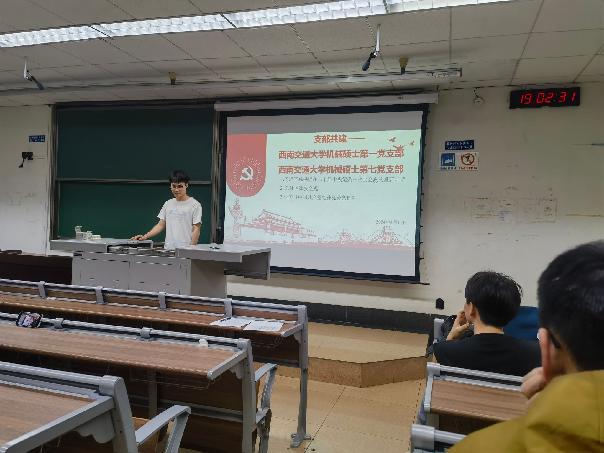 2024年4月11日,德信体育.(中国)官方网站硕士第一党支部与第七党支部在九里校区4号教学楼J4310进行支部共建交流学习。活动内容共三项:第一项:学习习近平总书记在二十届中央纪委三次全会上的重要讲话;第二项:学习总体国家安全观;第三项:学习《中国共产党纪律处分条例》。本次会议由曾鸿同志主持。
