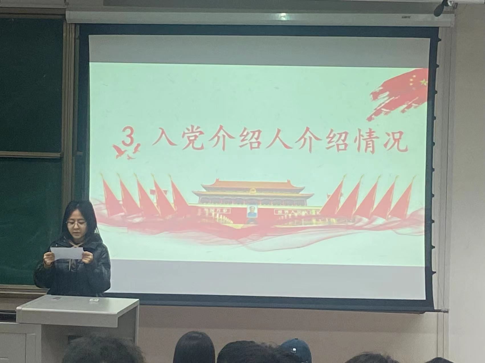 会议进行第三项:入党介绍人介绍基本情况。每个发展对象的入党介绍人介绍他们近期思想、学习、生活上的基本情况,就其优缺点展开阐述,同志们具有许多优点,但也存在不足,主要的缺点有:政治理论学习的自觉性不足和理论联系实际的能力有点欠缺。介绍人普遍认为发展对象基本符合党员入党的基本条件,且愿意为其申请加入中国共产党。