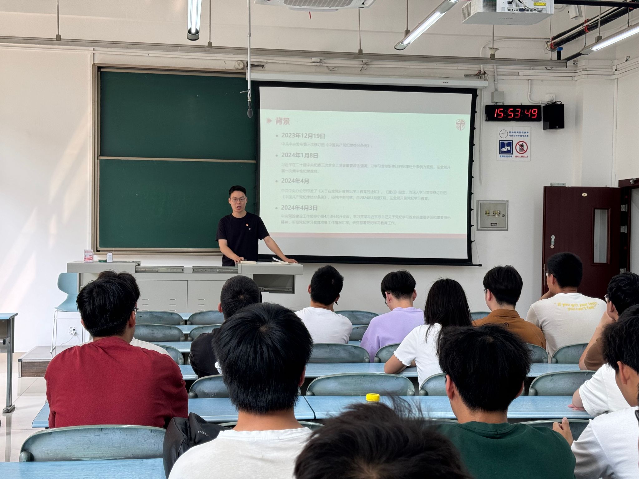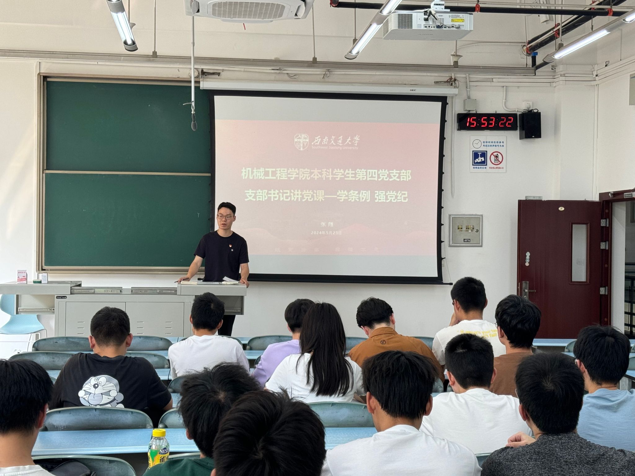 为深入学习贯彻习近平总书记关于党的自我革命的重要思想,扎实开展党纪学习教育,根据学院党委的统一要求,5月23日,本科学生第四党支部举行了“支部书记讲党课”活动,支部书记、学院青年讲师团成员张翔老师以“学条例,强党纪”为主题,为支部全体党员讲授了一堂纪律党课。
