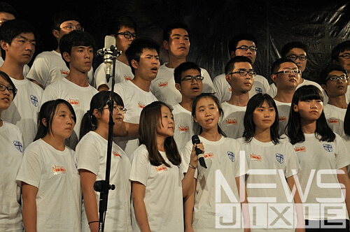 2013级机械7班是第三支上场的队伍,神采奕奕的同学们手持荧光棒,站成一圈合唱了《中国军魂》和《站起来》,最终得分为91.6分。