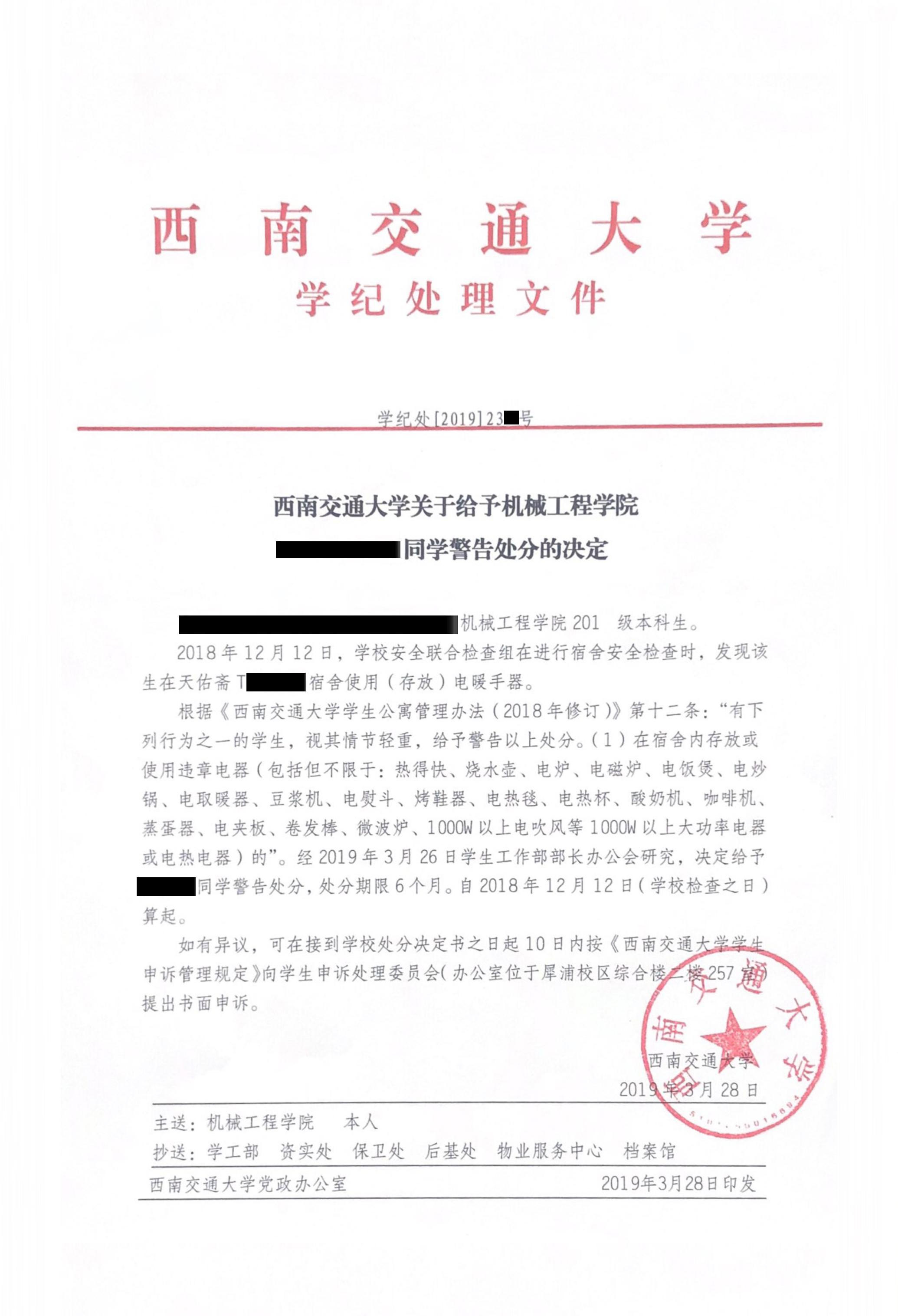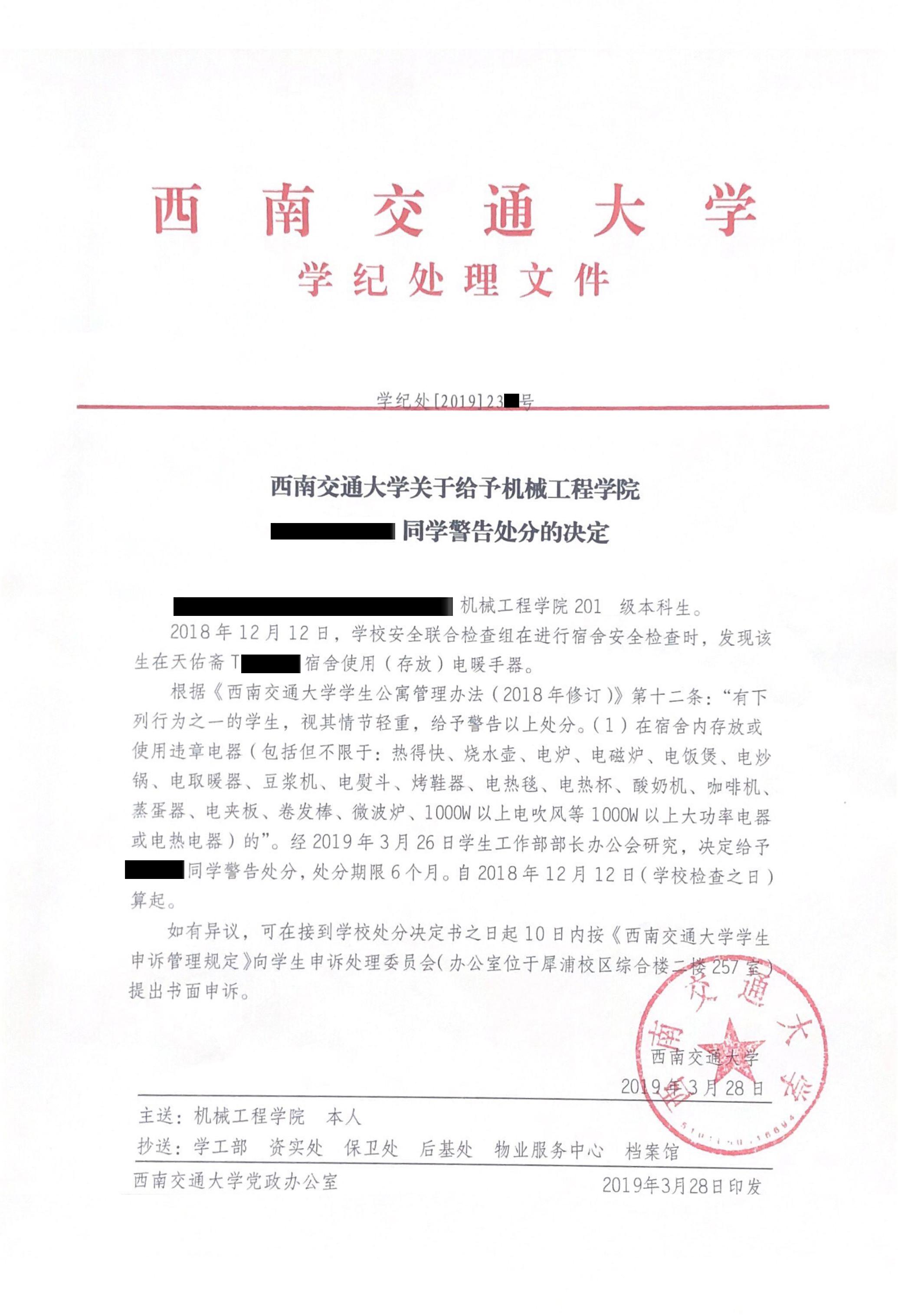学校于2018年12月12日开展了学生公寓安全联合检查,本次检查中德信体育.(中国)官方网站检查出两间寝室存放和使用违章电器,根据《西南交通大学学生公寓管理办法(2018年修订)》第十二条:有下列行为之一的学生,视其情节轻重,给予警告以上处分。触犯国家有关法律、法规的,依法移送公安机关。(1)在宿舍内存放或使用违章电器(包括但不限于:热得快、烧水壶、电炉、电磁炉、电饭煲、电炒锅、电取暖器、豆浆机、电熨斗、烤鞋器、电热毯、电热杯、酸奶机、咖啡机、蒸蛋器、电夹板、卷发棒、微波炉、1000W以上电吹风等1000W以上大功率电器或电热电器)的;经2019年3月26日学生工作部部长办公会研究,决定给予违纪的同学警告处分,处分期限6个月。