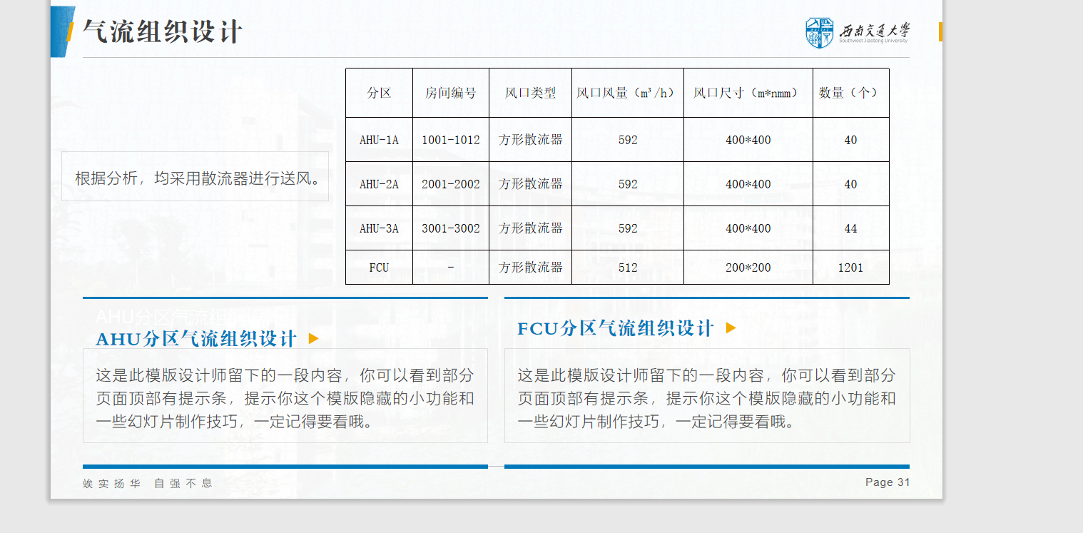 (6)气流组织计算:对空调风系统进行气流组织计算,确定送风口型式,风口位置、数量,送风参数,回风口布置。