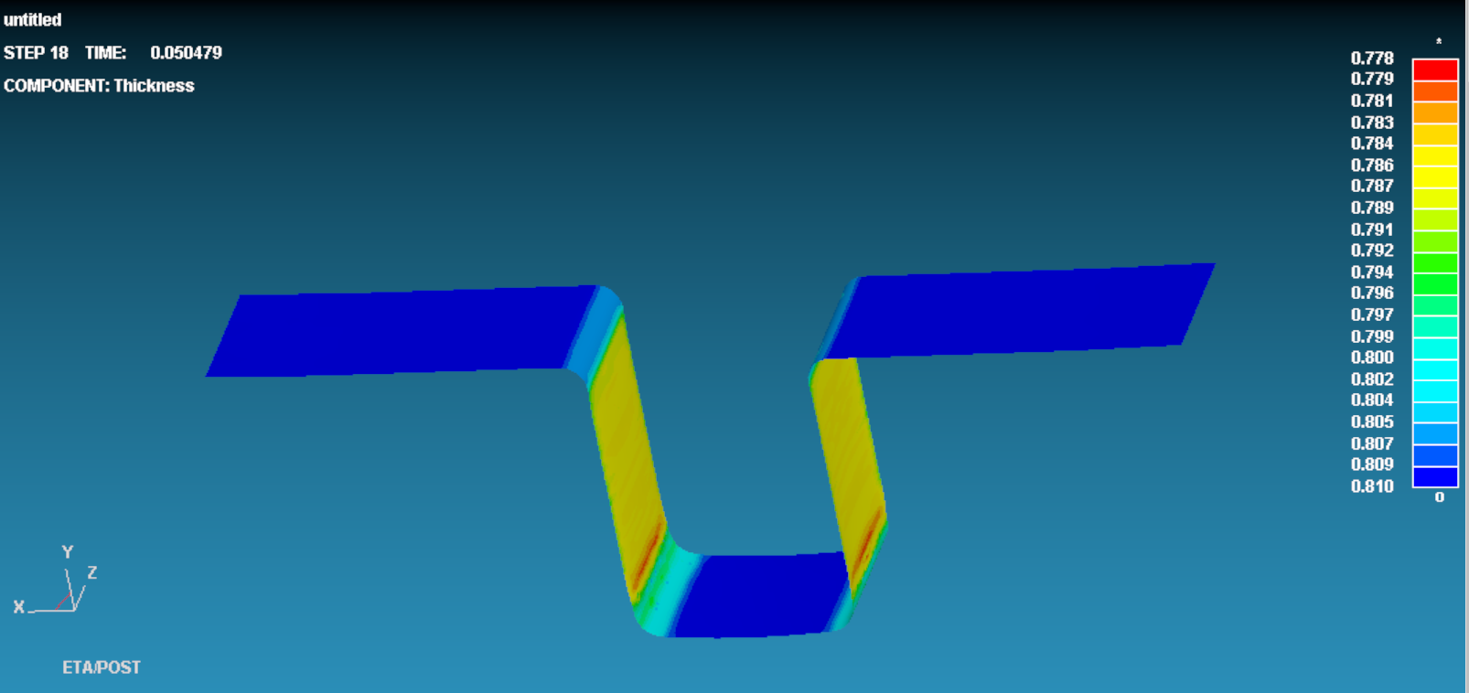 厚薄图如图所示,最小厚度为0.778,计算厚薄率为4%,小于10%,所以成形工艺不考虑起皱和拉裂等缺陷,只考虑回弹。
