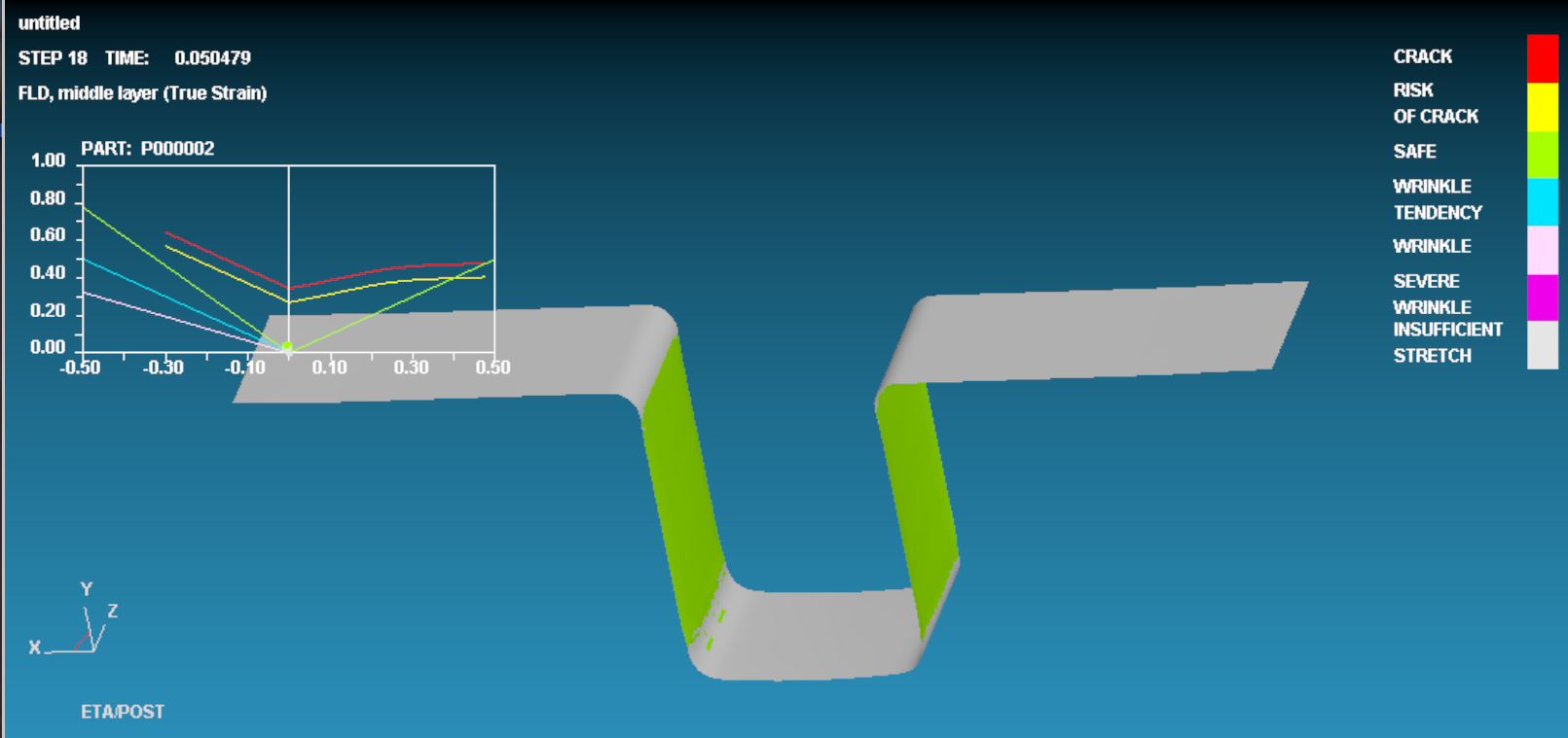 经过后处理得到U形件,其成形极限图如图所示,可以看出都处于绿色的安全区域;