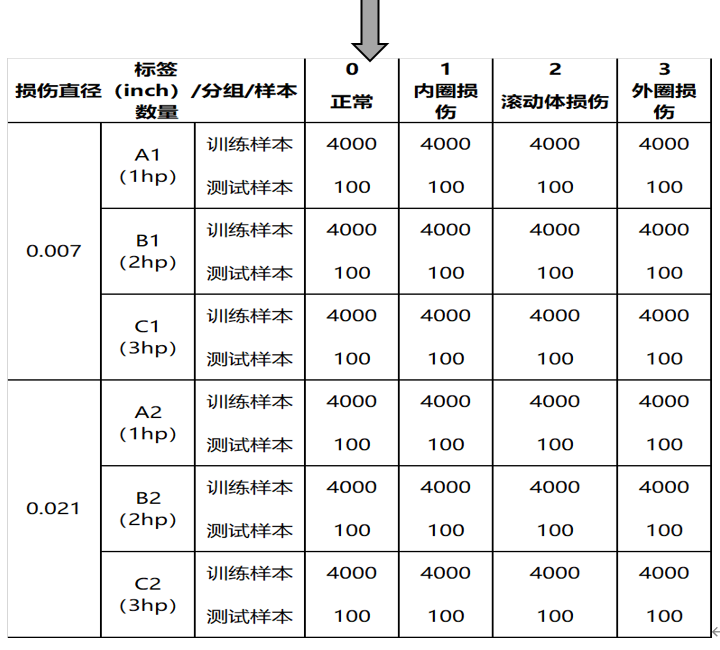 选用进行故障诊断的数据库为美国凯斯西储大学提供的CWRU轴承数据库,在轴承故障诊断领域,该数据库是目前公认的权威第三方轴承数据库。采用滑动采样技术对轴承数据库进行分组,如图2所示。例如,组号A1表示为损伤直径在0.007英寸、负载为1马力的分组(正常除外)。