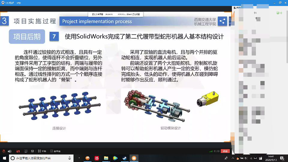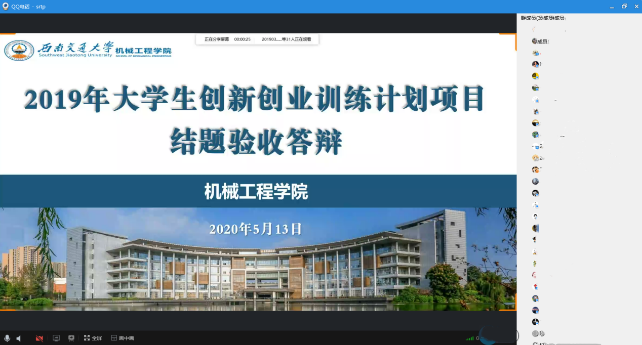 2020年5月13日下午14时,德信体育.(中国)官方网站2019年大学生科研训练项目(SRTP)结题答辩,在QQ群中通过群语音及屏幕分享的方式举行。本次线上答辩分成两组,副院长田怀文和院质保委员、机电测控系副主任陈春俊担任答辩组长,院质保委员秦萍、王月明、潘亚嘉、周斌,院教工委员邓斌、孟祥印、丁军君,机车车辆系主任黄运华等担任答辩评委,项目组指导教师以及28个项目组全体同学参与本次答辩活动。