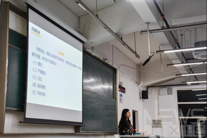 随后,蔡俊俊老师为大家讲解学校严格的纪律处分制度,并对可能触犯处分的事项进行了举例说明。处分制度的意义并不是为了惩罚,而是为同学们良好行为养成起到督促作用。