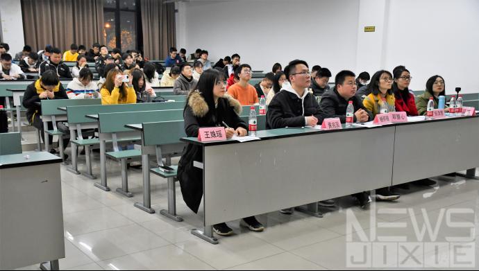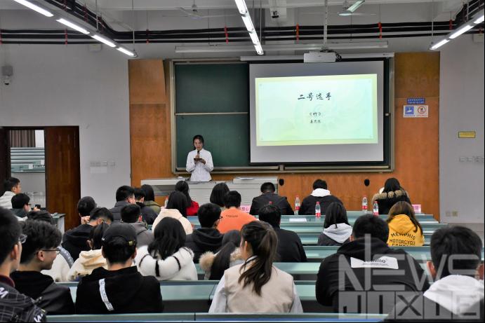 晚19时,在参赛选手和观众入座后,主持人做了一个简单的开场介绍,欢迎各位老师及同学们参与本次活动。在全场热烈的掌声下,本次活动的指导老师何蕊芯老师上台讲话并传达了活动精神。在主持人对决赛规则及评分准则进行介绍后,答辩正式开始。八位选手随机抽签决定上场顺序,他们每组都有5分钟的时间依次上台展示,用自己的作品诠释诚信的含义。