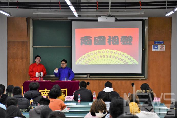答辩选手们按顺序依次上台答辩,在四号选手答辩后,活动进入激动人心的有奖竞猜互动环节,参与回答均可在比赛结束后领取一份精美小礼品。有奖竞猜结束后,由吴凌宇、吕游两位同学带来一段精彩绝伦的相声表演——《托妻献子》,他们用才艺以另一种形式向我们展示诚信,并且带动全场气氛,为决赛增添了一分欢快。互动环节结束后,比赛继续进行,由五号到八号选手上台进行答辩。