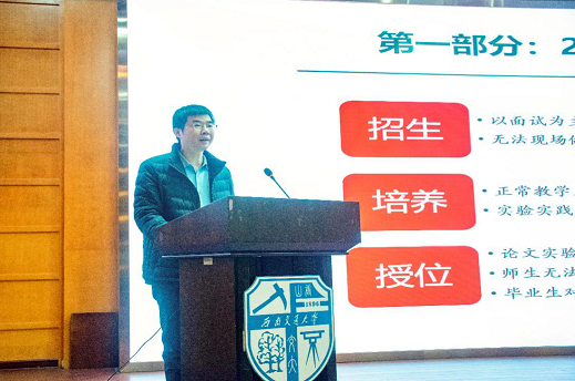 袁艳平就学位与研究生教育做出工作汇报。袁艳平表示2020年面临以面试为主的研究生复试无法照常进行,无法现场做招生宣传,信息传达不及时、不充分等实际困难,但在招生工作中学院坚持复试及复试过程中的各个考查项;采购防疫物资和复试设备、扩建试题库;组建疫情防控工作组、网络保障工作组,打造疫情之下的远程复试平台;采用考生双机位、复试双秘书制、流程三随机模式复试,共同打赢了疫情的攻坚战。