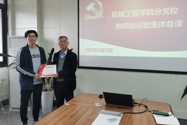 董大伟书记首先为党课教师颁发了学校党校培训结业证书,并对授课教师提出了四点要求:一是请授课教师严格要求自己,把握正确的政治方向,规范言行;二是认真做好备课,通过生动有趣的故事、案例,激发学生爱党爱国的热情;三是深入了解入党积极分子思想动态,开展调查研究,提升党课教育时效性;四是将积极分子培养培与三全育人结合起来,以党建带动学风建设,发挥入党积极分子的榜样作用。