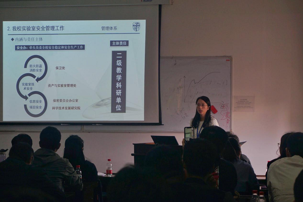 随后,资产与实验室管理处赵春花老师为师生介绍了学校实验室安全管理相关知识,首先是国家对实验室安全工作的要求和我校实验室安全管理工作,重点介绍了教育部检查指标、危险化学品及特种设备的管理,随后她还介绍了我校实验室安全教育宣传活动。她讲到我校实验室安全工作按照“统一领导、分级负责、责任到人”的模式,实行学校、二级教学科研单位、实验室的三级管理制度。赵老师还展示了学校与各二级教学科研单位签订实验室安全责任书、学校层面的规章制度以及我们身边的安全隐患等,最后她介绍了我校2021年度实验室安全教育宣传活动,倡导师生积极参加活动,提升实验室安全意识,共筑和谐平安校园。