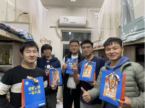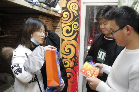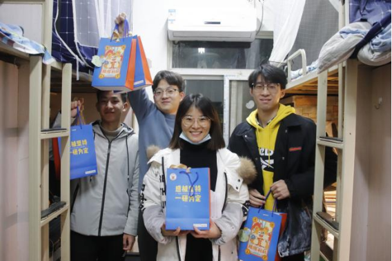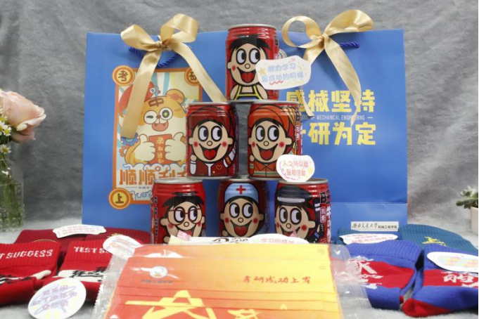 本次送温暖活动中的“锦囊”由“成绩旺旺”旺仔牛奶,机械定制口罩、“上岸”袜、巧克力和辅导员手写的祝福便利贴组成。“上岸成功”“攻克难题”“力拔头筹”一双双定制袜子上是对考研学子简洁却有力量的祝福,也希望在寒冷的冬日给大家带来温暖;而巧克力可以给奋斗学习的大家带来一些能量,寓意巧用方法,攻克难题,力拔头筹;而辅导员的亲笔爱心便利贴上有各种手绘图案和祝福语,背面则是由2018级同学夏大为、张乐乐绘制的锦鲤——机械师生携手坚持,祝福大家成功上岸;印着老虎卡通形象“锦囊袋”由18级辅导员李曦绘制,交大蓝机械黄为主色调,画里老虎手中举着录取通知书,希望同学们在疲惫的枯燥的备考中,可以感受到学院的温情与关心。
