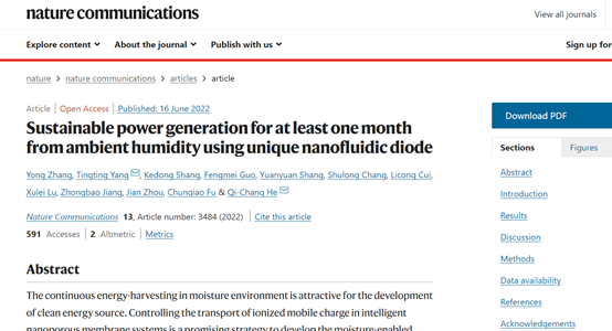 近日,我院摩擦所何其昌教授团队青年教师杨婷婷副研究员,在Nature Communications上发表了题为《Sustainable power generation for at least one month from ambient humidity using unique nanofluidic diode》的学术论文。该论文的第一作者为德信体育.(中国)官方网站博士研究生张勇,共同通讯作者为杨婷婷副研究员和何其昌教授。