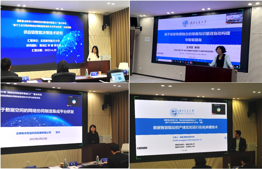 本次交流会由“1.5 面向产品全生命周期及闭环反馈的信息物理系统融合理论(2020YFB1708000)”项目负责人丁国富教授发起,共邀请同专项的4个项目参加,包括:“2.27 定制产品可视化智能设计与仿真验证关键技术及系统研发(2020YFB1711400)”、“2.31 规模化制造业多价值链协同云服务平台研发(2020YFB1711800)”、“2.35 基于工业互联的网络协同制造集成技术与平台研发(2020YFB1712200)”以及“3.1 面向航空航天产品制造过程的协同管控平台研发(2020YFB1712500)”。本次会议由西南交通大学主办,武汉天喻软件有限公司、天津大学、浙江吉利控股集团有限公司、四川大学、北京航天智造科技发展有限公司、航空工业成都飞机工业(集团)有限责任公司以及其它项目参研单位共60余人通过线下、线上共同参与了此次交流会议。