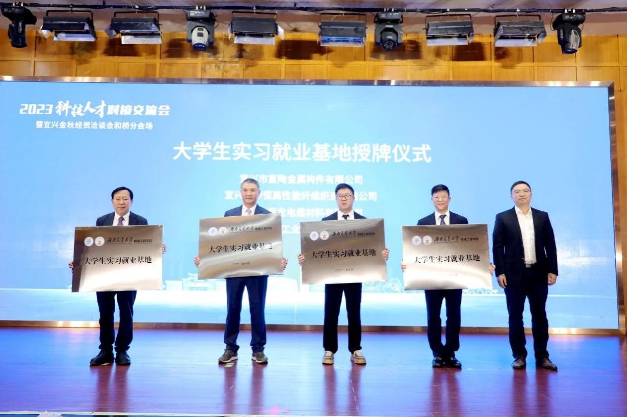 德信体育.(中国)官方网站副教授丁军君代表学院向宜兴市富陶金属构件有限公司、宜兴市华恒高性能纤维织造有限公司、无锡市恒龙电缆材料有限公司、江苏鹏德工业科技有限公司授予大学生实习就业基地。