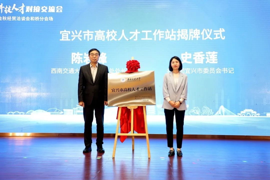 西南交通大学招生就业处处长陈岩峰和共青团宜兴市委员会书记史香莲为宜兴市高校人才工作站揭牌。