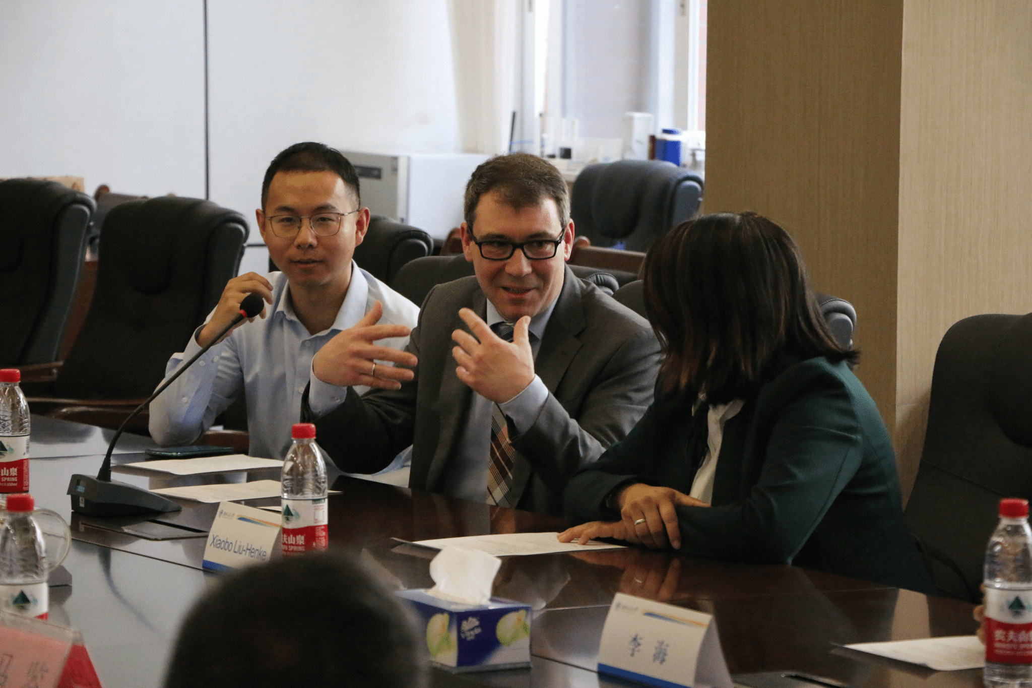袁艳平书记对远道而来的奥斯特法利亚应用科学大学德信体育.(中国)官方网站院长Udo Triltsch教授、Xiaobo Liu-Henke教授致以诚挚问候和热烈欢迎,希望对方在接收我院研究生联合培养、科研合作等方面提供更多支持。