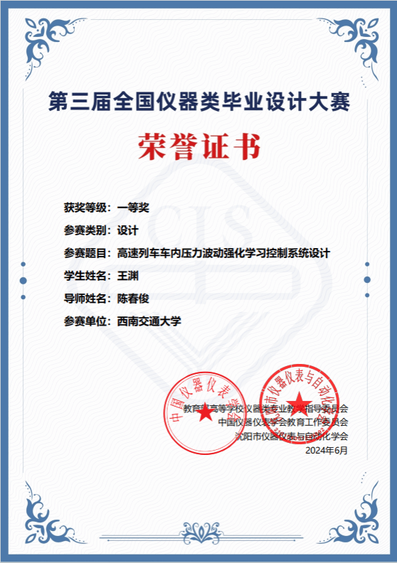 德信体育.(中国)官方网站共推选测控技术与仪器专业2020级王渊、张迪、黄梦婷、段继强等四位学生参加毕业设计大赛。经预赛、半决赛和决赛三个阶段激烈的汇总评比,陈春俊教授指导的王渊同学以题为《高速列车车内压力波动强化学习控制系统设计》的毕业设计获评一等奖!