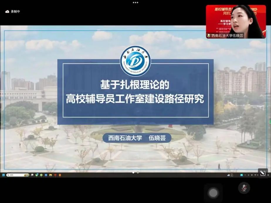 西南石油大学计算机与软件学院高级辅导员伍晓芸作题为“基于扎根理论的高校辅导员工作室建设路径研究”的报告。伍晓芸根据高校辅导员工作室的建设现状,采用扎根理论研究方法,构建了高校辅导员工作室建设的理论模型,对全国高校辅导员工作室的建设过程进行了研究,提出了五项优化策略建议。