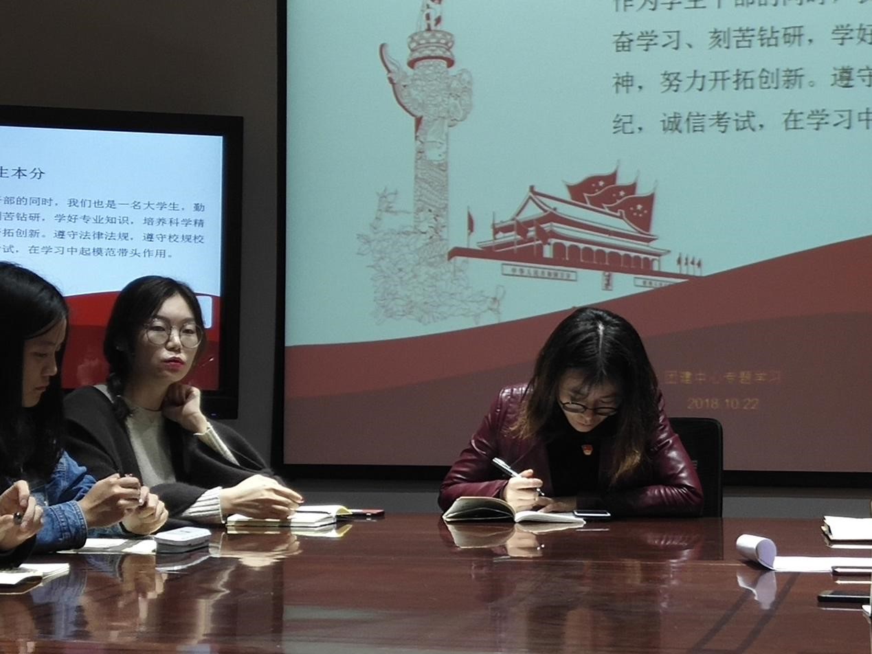 迎百年机械,为营造良好的学生组织氛围,树立正确的学生干部作风,机械团建中心于2018年10月22日21点在X2201组织进行了以“忠诚担当听党话,奋斗清廉树人生”为题的干部学习会议。机械团建中心指导老师邓慧心到场主持会议,团建中心主任及部长到场学习并分享学习心得体会。