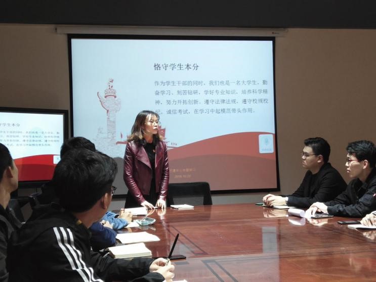 随后,团建中心各个部门部长就其中一点或两点,结合自身经历体会分别发言。强调了:1.学生干部与其他同学应为平等关系,应对其他同学有应有的尊重;2.学生干部应该培养自身的奋斗精神,提升自身道德素养;3.学生干部应该是校园风气与班级氛围的引导者,应该摒弃不良风气,起模范带头作用。