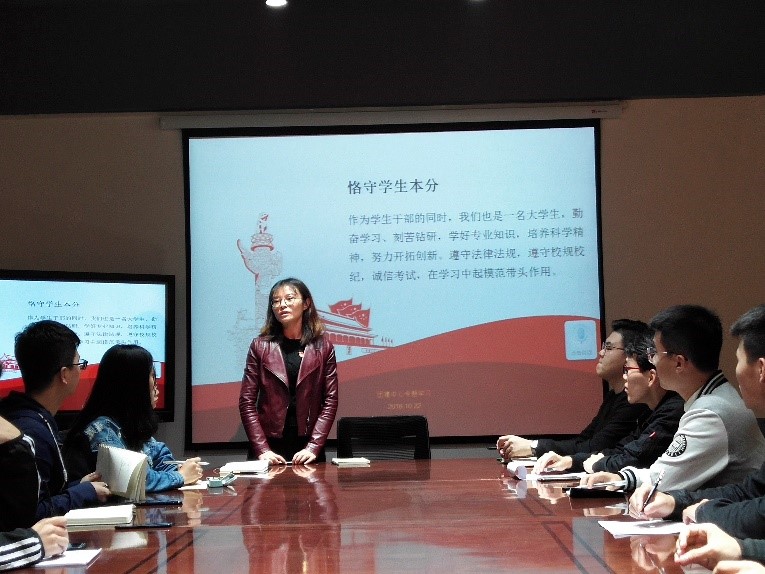 会议伊始,指导老师邓慧心带领大家朗读了学生干部作风相关守则,并就守则记录发表了自己的看法。邓慧心老师强调:“学生干部在大学中应以学习为主,应起模范带头作用,要树立为同学们服务的良好工作态度”。