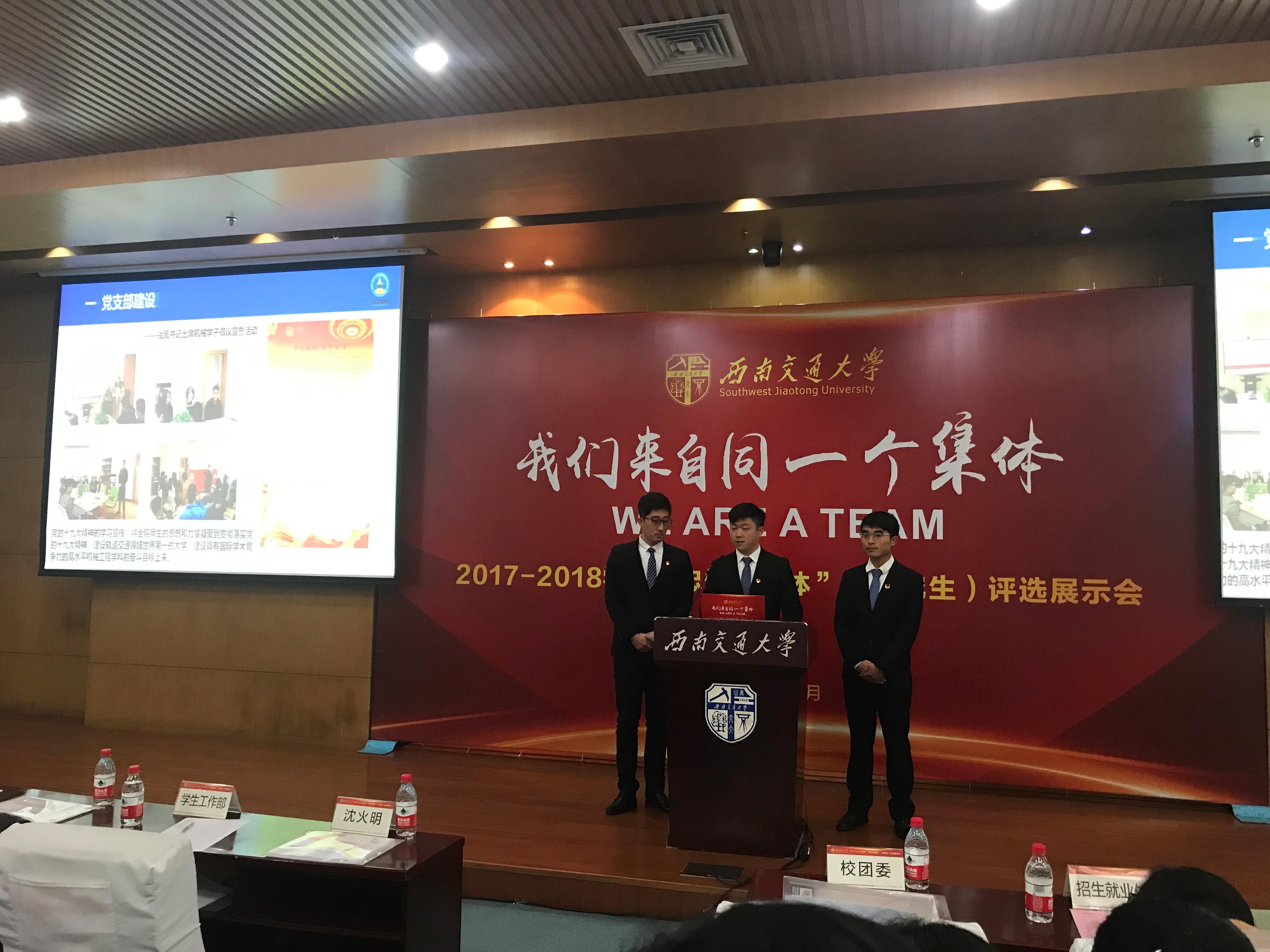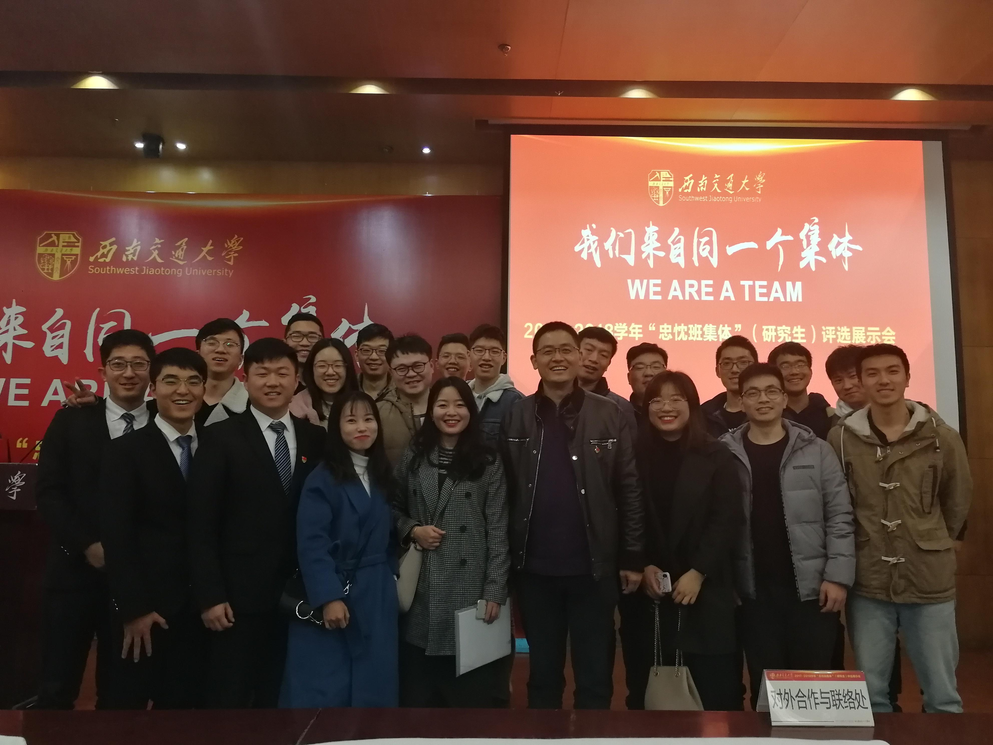11月27日下午2时,西南交通大学2017-2018学年研究生“忠忱班集体”(研究生)答辩会在犀浦校区图书馆第一报告厅隆重举行。校学生工作部、研究生院、招生就业处、科学技术发展研究院、对外合作与联络处、校团委的相关领导和各学院学生工作负责人出席本次评选展示会并担任评委。本次答辩会,共有15个17级研究生班级参与答辩。我院17级博士班与17级硕士9班入围评选,17级博士班最终荣获“忠忱班集体”称号。