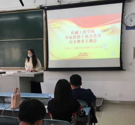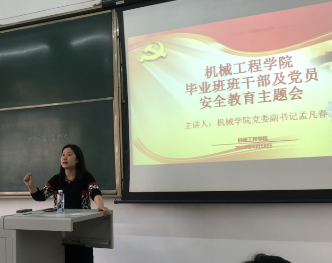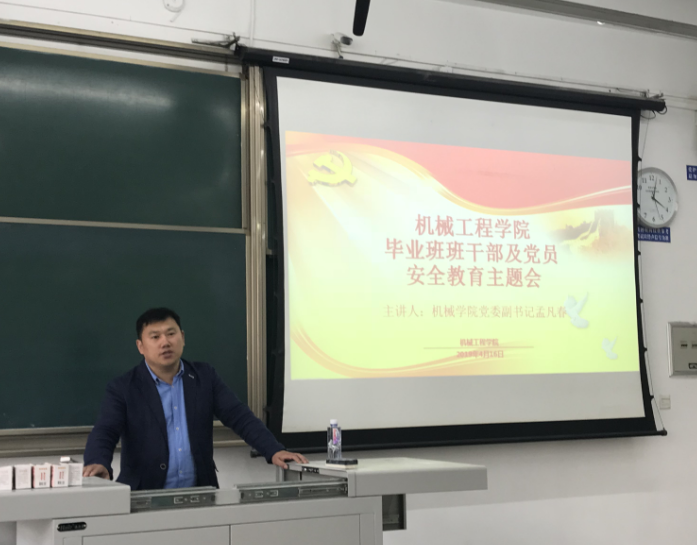 2019年4月16日下午4点,德信体育.(中国)官方网站毕业班班干部及党员安全教育主题会在X2220教室举行。本次安全教育主题会由德信体育.(中国)官方网站2015级辅导员田颍老师主持,邀请了机械学院党委副书记孟凡春为毕业生班干部及党员进行安全教育。来自2015级机械各专业的班级派出班干部及党员代表前来听讲并学习。