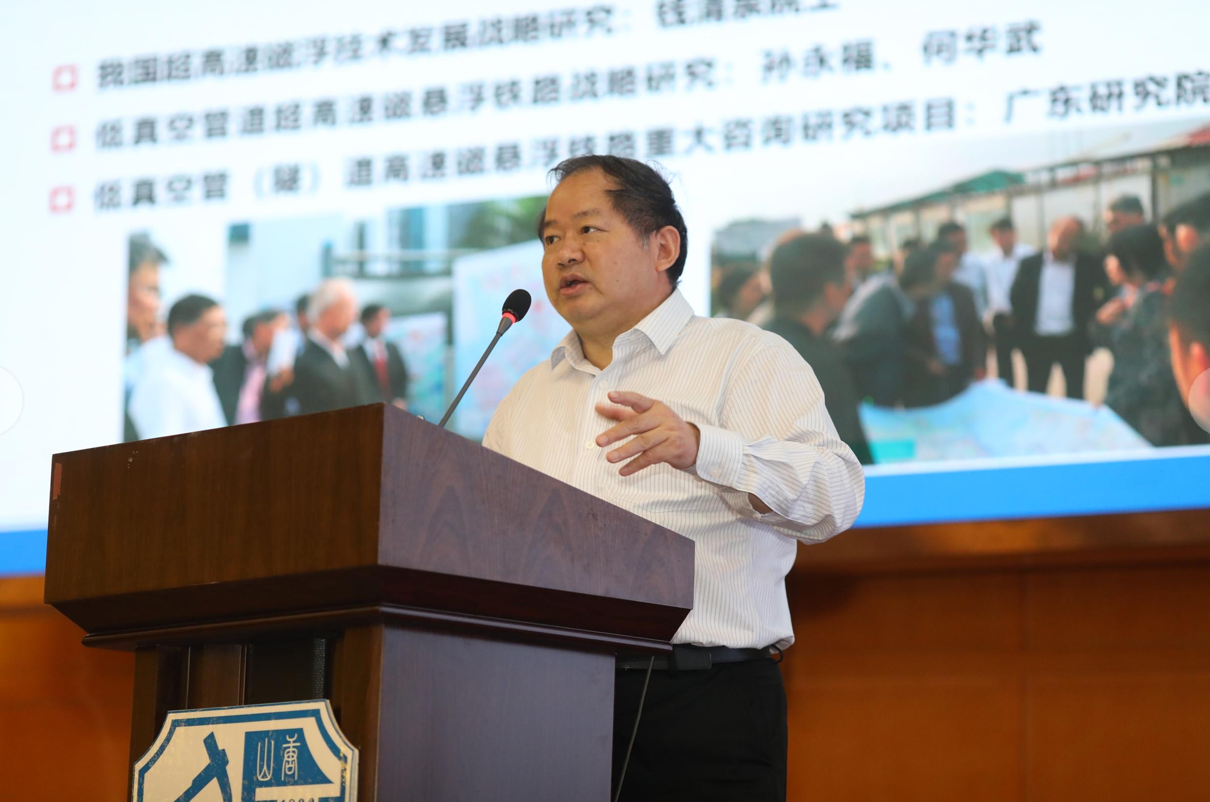 张卫华教授作了题为《超高速低真空磁浮交通技术研究》的报告,介绍了超高速低真空磁浮交通项目的背景,梳理了制式、真空度、管道、列车结构等研究的最新成果。