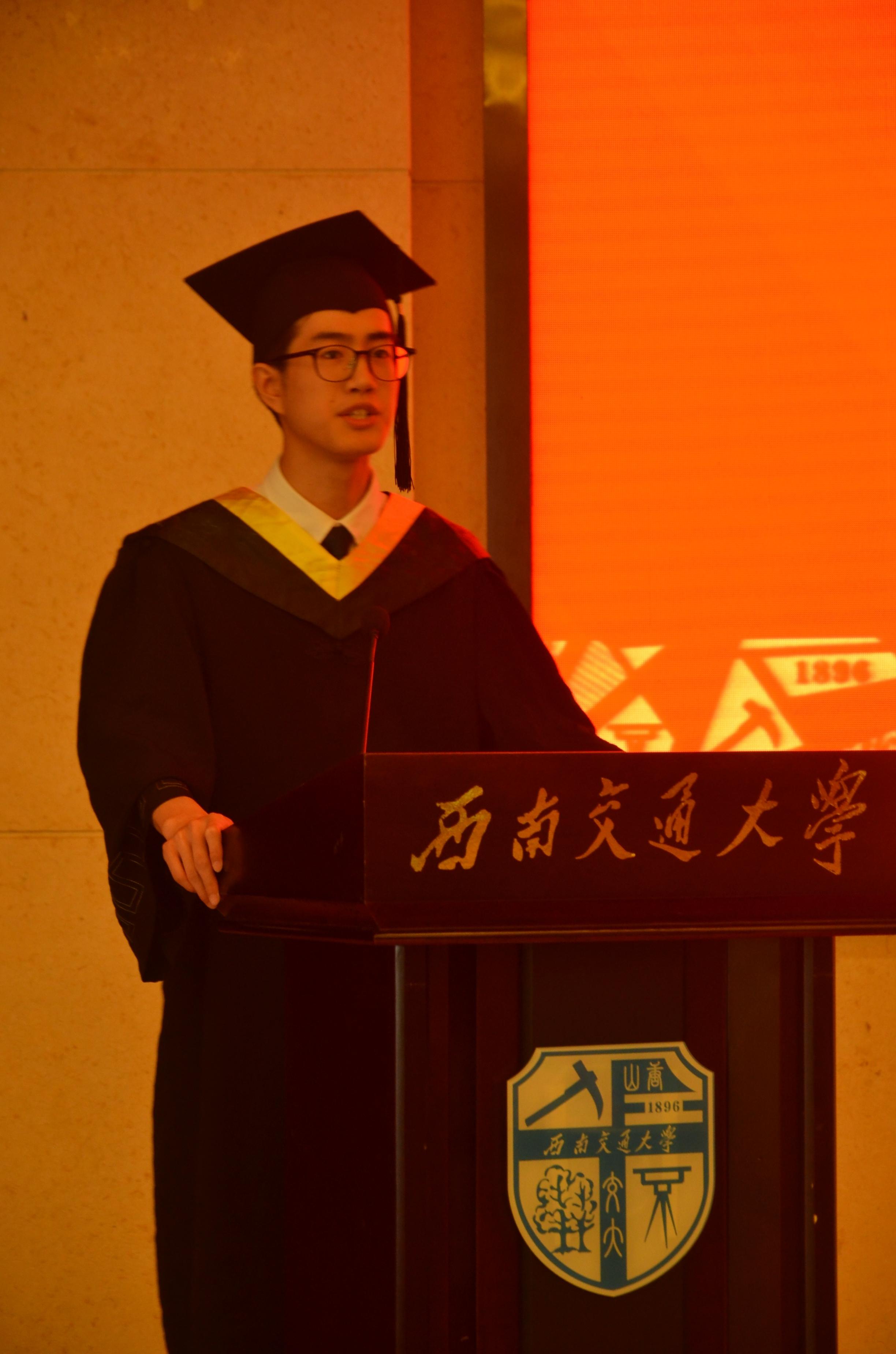 学生代表张易飞上台发言,从自己失败经历、奋斗轨迹、心路历程、收获成果回顾四年大学生活。他说:“大学四年也曾憧憬过、也曾颓废过、也曾奋斗过,五彩斑斓是为青春。”并祝福各位同学毕业快乐,江湖再见。