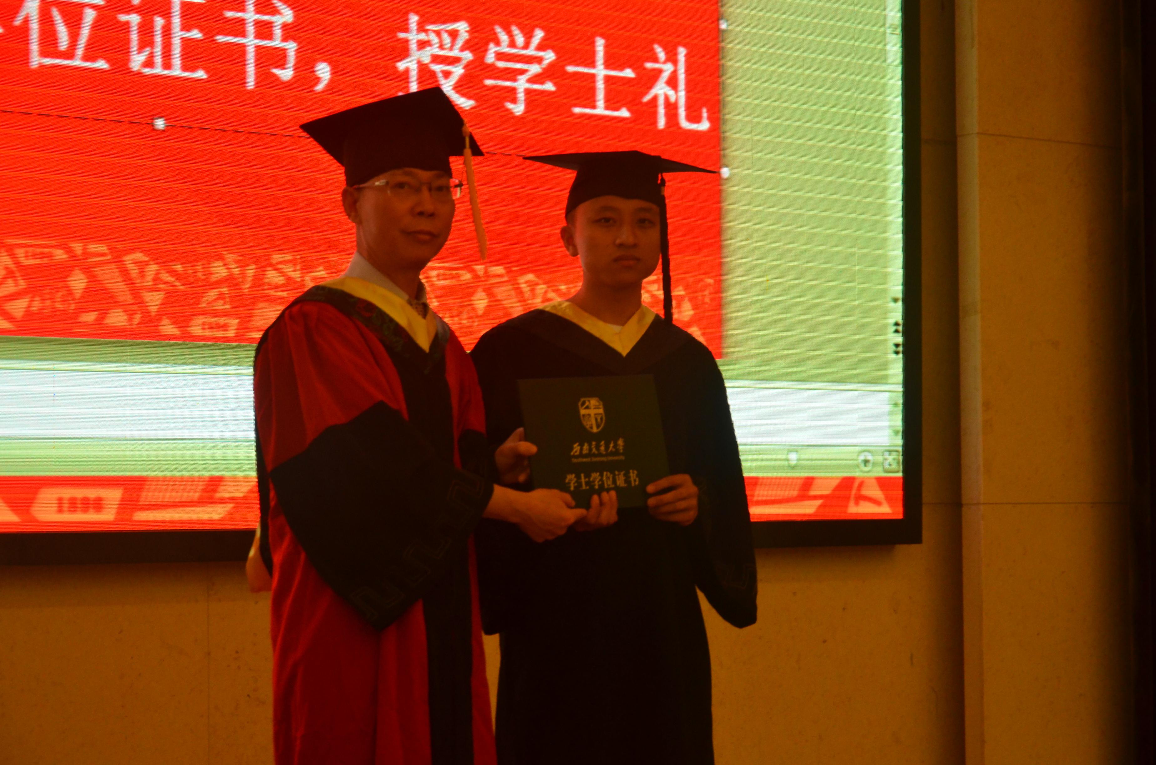 接下来,机械学院董大伟教授为全体毕业生颁发学位证书,并授学士礼。一次次亲切的握手,四方帽上的流苏一次次从右至左,一次次合影留念,无不体现学院对毕业生的关怀与祝福。