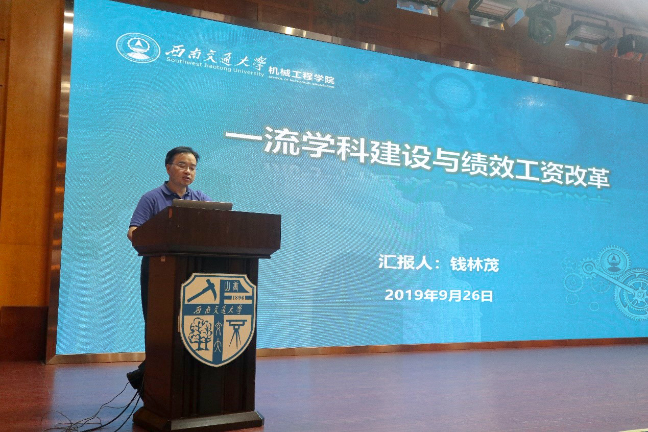 钱院长以机械学科背景为切入点,结合国家战略需求,阐明中国制造2025需要实施的五大工程均与机械工程学科紧密相关,10个重点领域中6大领域与机械学科紧密关联;针对基础件性能提升、高端制造、创新设计、车辆工程等机械领域国家现阶段发展的卡脖子问题对机械学院提出了优化学科布局,凝练学科方向的总结建议;紧接着钱院长分析了西南交大机械学科的优势和发展机遇,点明四川省产业发展需求与机械工程学科密切相关;通过与其他院校机械工程学科的对比,指出机械学院在一流学科建设过程中的缺点和不足,学科发展面临一定的困难和压力,亟需加速发展和突破。