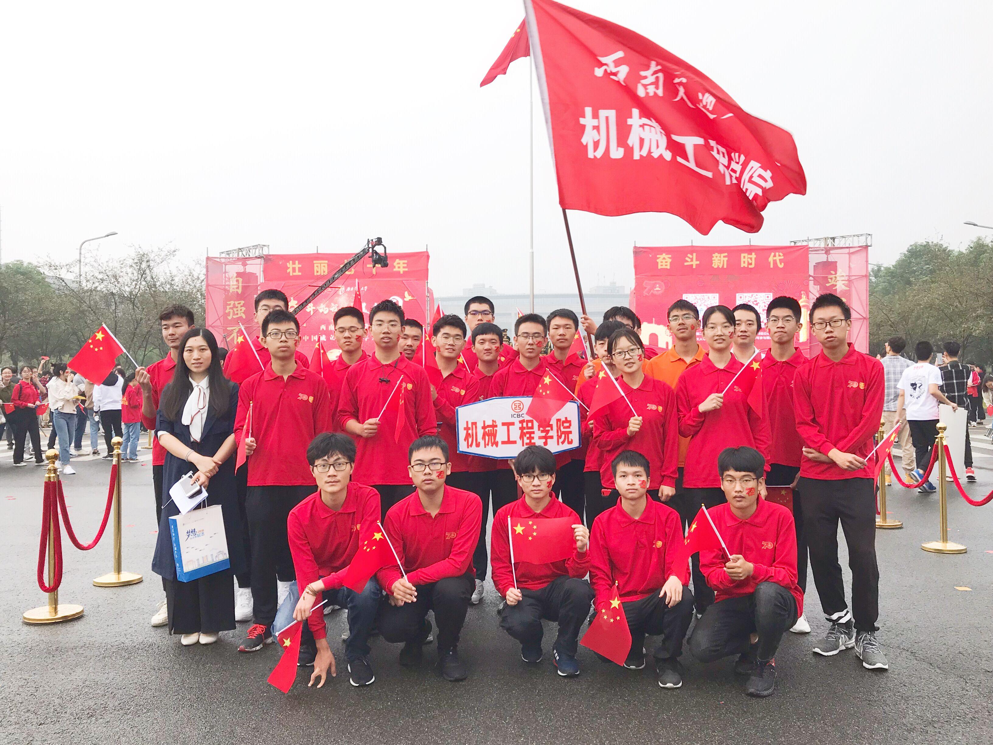 上午7时20分,犀浦校区国旗台前,由我院60名学生代表组成的方队第一个列队完毕,参加学校举办的“壮丽七十年,奋斗新时代”升旗仪式。另外还有百余名机械学子也早早地赶到现场观礼。仪式中,2016级机械专业的杨天澍同学代表全院同学朗诵了我院学子写给祖国的三行情诗——