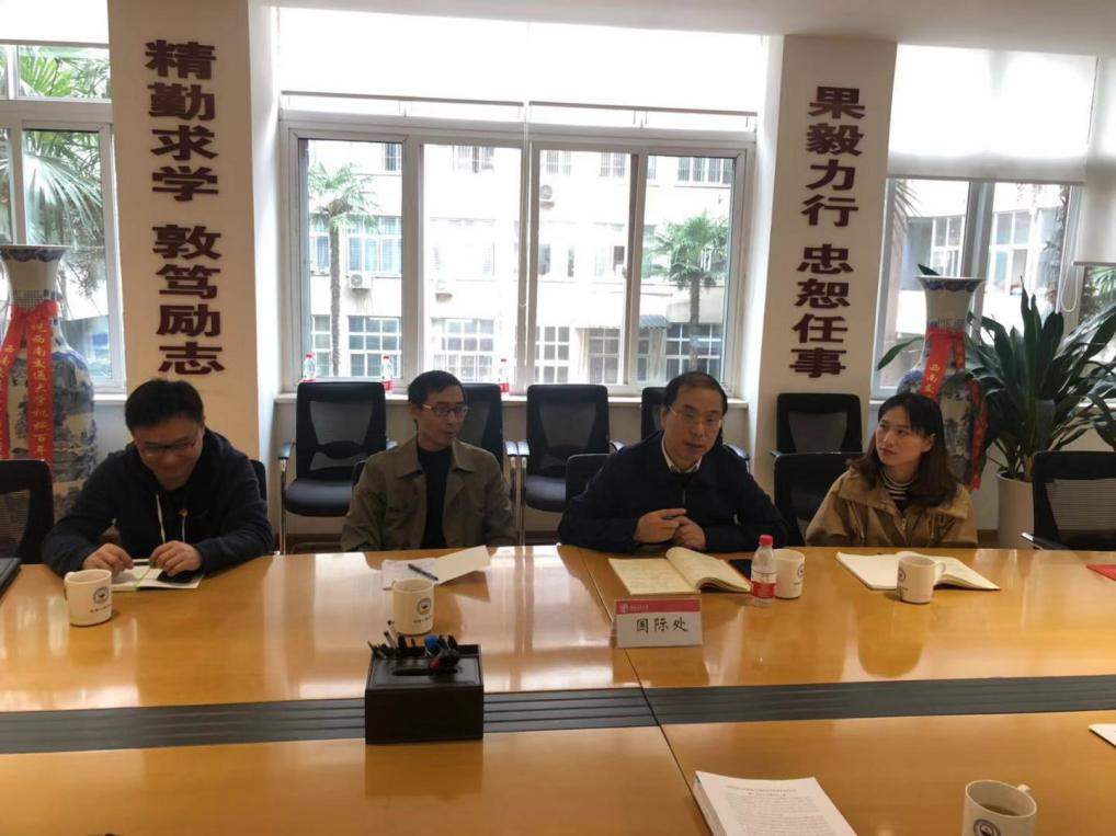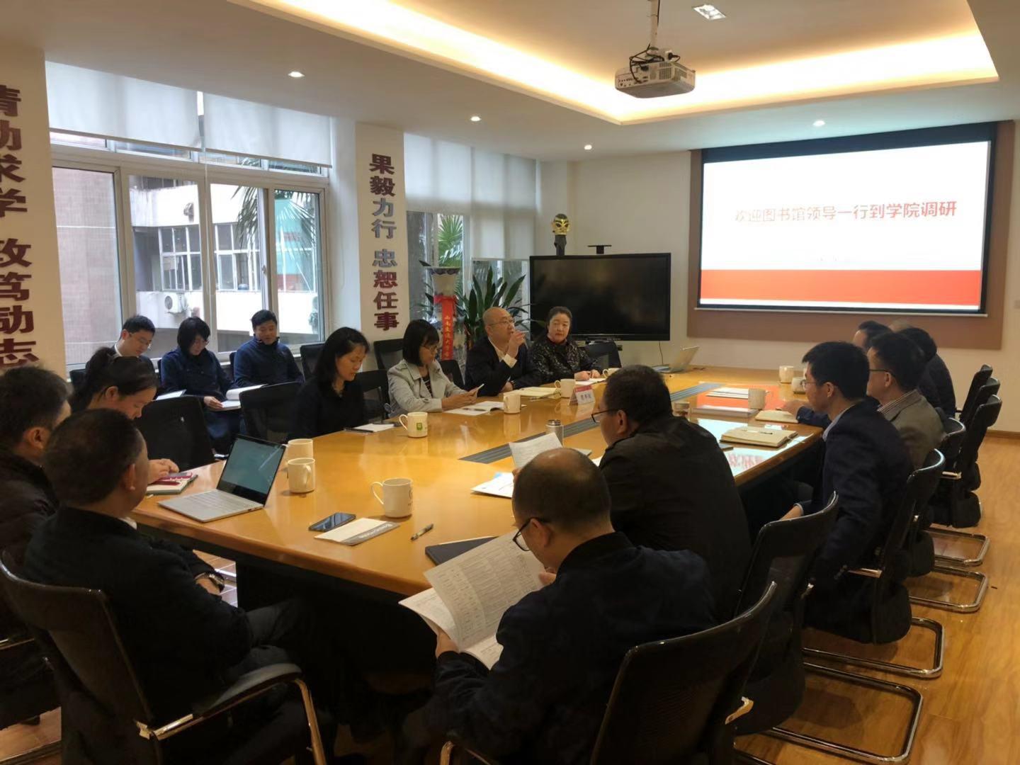 10月25日,图书馆张祖涛馆长一行、国际处任新红院长一行到学院调研。钱林茂院长对学院的基本情况、学科建设、期刊论文发表和国际化建设作了介绍。图书馆陈丽华副馆长就图书馆建设情况做了介绍,双方就期刊数据统计、论文发表、资源建设、服务定制等方面进行了细致的交流。与会班子成员与国际处领导在学院国际合作伙伴、学生国际化、教师国际化、科研国际化等各方面的现状与规划进行了深入交流。